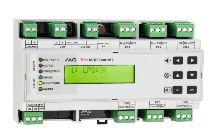 1/1 Control Unit Modules Teta MOD Control 1 Product code: PW-0108 Teta MOD Control 1 is responsible for communication with Teta Gas detectors, processing field signals, indication of the system status for the operator as well as overall control of the system operation. See full description Functionalities: Certificates: Product description Technical details Control Unit Module Teta MOD Control 1 is a device designed as a part of the Gas Safety Systems Teta Gas. The module uses the Digital Data Transmission – Teta Bus to enable both power supply and addressable communication with field gas detectors by means of merely a single pair of wires. Teta MOD Control 1 is responsible for communication with Teta gas detectors, processing field signals, indication of the system status for the operator as well as overall control of the system operation. Key advantages of the module: Handling up to 50 devices connected directly to the Teta Bus port: handling up to 50 gas detectors, handling up to 8 valve controllers, handling up to 26 signalling devices (optical-acoustic signalling devices or warning LED display). 6 relay outputs 2 binary inputs. Identification of hazardous locations – in case of gas leaks on the facility area the control unit enables operators to identify locations with possible hazards. Broad configuration options with the following functionalities: discrimination of signals from detectors of flammable gases or toxic gases – it enables separation of signals from various sources of gas hazards and selective control of the ventilation system. It is also possible to produce a signal to trip the fire protection system only in selected cases, when it is actually needed, control of actuators by signals from a group of detectors installed on a specific area (e.g. in one room or workshop). Separate control outputs for flammable and toxic gases to be monitored. Device configuration: Product Code Device Description PW-108A Teta MOD Control 1 Control Unit Module Teta MOD Control 1 Control Unit Module for DIN rail mounting. PW-086-Control1-S Teta MOD Control 1-S Control Unit Module Moduł Jednostki Sterującej Teta MOD Control 1 enclosed in a distribution box, for wall mounting, IP65. Supports 24V DC UPS. Dimensions 432/290.5/160 PW-086-Control1-S24 Teta MOD Control 1-S24 Control Unit Module Teta MOD Control 1 Control Unit Module with 230/24V 60W power supply, enclosed in a distribution box, for wall mounting, IP65. Dimensions 432 x 290.5 x 160 PW-086-Control1-S48-60 Teta MOD Control 1-S48-60 Control Unit Module Teta MOD Control 1 Control Unit Module with 230/48V 60W power supply, enclosed in a distribution box, for wall mounting, IP65. Dimensions 432 x 290.5 x 160 PW-086-Control1-S48-100 Teta MOD Control 1-S48-100 Control Unit Module Teta MOD Control 1 Control Unit Module with 230/48V 100W power supply, enclosed in a distribution box, for wall mounting, IP65. Dimensions 432 x 290.5 x 160 PW-086-Control1-S48-150 Teta MOD Control 1-S48-150 Control Unit Module Teta MOD Control 1 Control Unit Module with 230/48V 150W power supply, enclosed in a distribution box, for wall mounting, IP65. Dimensions 432 x 290.5 x 160 PW-086-Control1-S-UP300 Teta MOD Control 1-S-UP300 Control Unit Module Teta MOD Control 1 Control Unit Module with 24/48V 300W power supply, enclosed in a distribution box, for wall mounting, IP65. Supports 24V DC UPS. Dimensions 295 x 458 x 129 Power supply Voltage VCC 15 – 50 V Power PCC 2.5 W Environment Ambient temperatures 0 – 50 °C Humidity 10 – 90% long term 0 – 99% short term Pressure 1013 ± 10% hPa pH 5.5 – 7 IP IP20 Digital input parameters (binar, DI) RIN 10 kΩ Inactive (not negated) 0 – 1 V Active (not negated) 10 – 50 V Other Signal type: DC (any polarisation), AC (50 Hz), Any polarization > 1s Digital output parameters Relay Floating contacts, NO/NC AC12: 230 V ~ / 3 A DC1: 230 V / 0.25 A DC1: 24 V / 3 A Not protected against overloading Digital communication parameters TETA BUS port Communication protocol Teta Bus GTW port Electric standard RS – 485 Communication protocol Modbus ASCII / RTU, 4800 – 115200 b/s, no parity / even parity/ odd parity, number of bits 7/8 (only for Modbus ASCII) Integrated signalling equipment (visual) LCD alphanumerical display 2 x 16 LED indicator Integrated signalling equipment (audible) 70 dB 1 m distance Protection class III Cable glands (cable diameter range) 0.08 – 2.5 mm2 (cable lugs 2 x 1 mm2 or 2 x 0.75 mm2 should be used for double wires) Enclosure material Self-extinguishing PPO Weight 0.4 kg Mounting On DIN-35 / TS35 Videos Placement and role in the system Files to downloadDatasheets:Teta MOD Control 1 Control Unit Module - Datasheet Download fileUsers's manual:Teta MOD Control 1 Control Unit Module - User Manual Download fileCE declarations:Teta MOD Control 1 Control Unit Module - Declaration of Conformity Download fileOthers:System Guidebook - Gas Detection & Safety System Teta Gas Download fileSystem Configuration Table Download file Related products Control Unit ModulesTeta MOD Control 1SignallersWarning LED Display TOLEDSignallersTeta SOLERTGas DetectorsTeta EcoWentGas DetectorsTeta MiniDetGas DetectorsTeta EcoDetGas DetectorsTeta EcoCO2Gas DetectorsTeta EcoHGas DetectorsTeta EcoNGas DetectorsTeta EcoO2Gas DetectorsTeta EcoTerm The Teta System Configurator This configurator allows you to declare specific devices as well as the distance between them – as a result, you receive a list of devices and dedicated cabling. Go to configurator Reliable and Innovative Gas Safety Systems