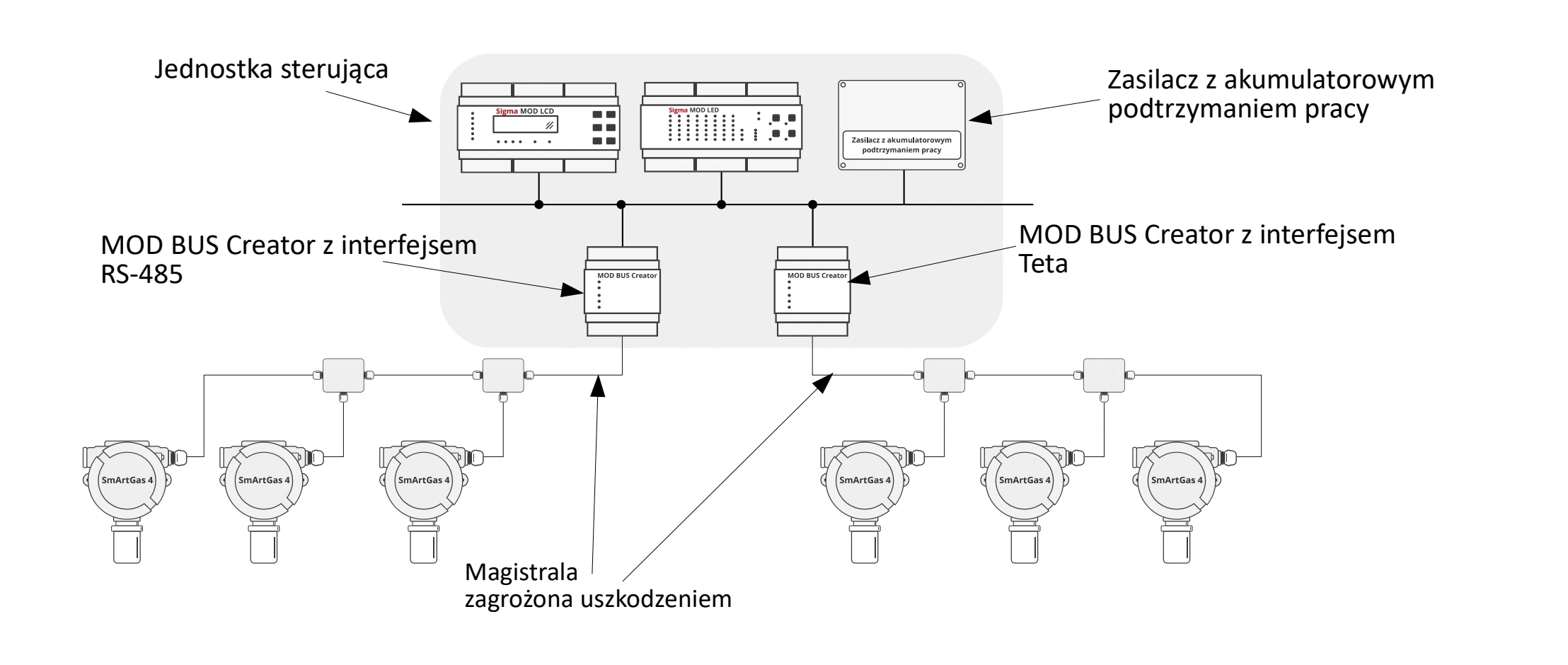 1/1 Akcesoria Sterownik Magistrali MOD BUS Creator Kod produktu: PW-120-X Sterownik Magistrali MOD BUS Creator to urządzenie które umożliwia podział magistrali danych RS-485 na pod-magistrale, wykonane w standardzie RS-485 lub Teta (standard komunikacyjny Atest Gaz). Zobacz pełny opis Opis produktu Dane techniczne Sterownik Magistrali MOD BUS Creator to urządzenie które umożliwia podział magistrali danych RS-485 na pod-magistrale, wykonane w standardzie RS-485 lub Teta (standard komunikacyjny Atest Gaz). „Pod-magistrala” utworzona przez urządzenie posiada odrębne, regulowane zabezpieczenie przeciwprzeciążeniowe, przeciwprzepięciowe oraz separację logiczną linii transmisyjnych. W przypadku fizycznego uszkodzenia przewodu lub awarii dowolnego z urządzeń podpiętych do pod-magistrali, zagrożony utratą funkcjonalności będzie jedynie wydzielony fragment systemu. Sterownik Magistrali MOD BUS Creator dokona walidacji oraz filtracji danych odbieranych z magistrali, oraz odetnie zasilanie w przypadku wykrycia zwarcia lub iskrzenia, tak aby błędne sygnały nie blokowały komunikacji w nieuszkodzonej części systemu. Znamionowe parametry zasilania Napięcie 12 – 50 V Maksymalny prąd pobierany z Internal Bus PW-120-485: 6,5 A PW-120-T: 4 A Maksymalna moc pobierana przez urządzenie, odliczając Field Bus 0,6 W Warunki środowiskowe Zakres temperatur otoczenia -20 – 40°C Zakres wilgotności względnej 10 – 90% ciągle 0 – 99% chwilowo Ciśnienie 1013 ± 10% hPa IP IP20 Parametry wyjść cyfrowych Przekaźnik Styki bezpotencjałowe, przełączne: AC12 : 50 V ~ / 0,5 A DC1: 50 V / 0,5 A Niezabezpieczone Parametry komunikacji cyfrowejPort Internal BUS Standard elektryczny Protokół komunikacyjny Prędkość Parzystość Liczba bitów RS-485 Dowolny, Modbus RTU (zależnie od konfiguracji urządzenia) 1 000, 1 200, 2 400, 4 800, 9 600, 19 200, 38 400, 57 600, 115 200 Bd Brak / parzysta / nieparzysta 7/8 Port Field BUS Standard elektryczny Protokół komunikacyjny Prędkość Parzystość Liczba bitów RS-485 lub Teta BUS (zależnie od wersji urządzenia) Dowolny, Teta BUS (zależnie od wersji urządzenia) 1 000, 1 200, 2 400, 4 800, 9 600, 19 200, 38 400, 57 600, 115 200 Bd Brak / parzysta / nieparzysta 7/8 Zwiększona odporność na zakłócenia elektromagnetyczne Port Field BUS Odporność na udary: ± 4 kV linia do ziemi (line-to-earth), ± 1,25 kV linia do linii (line-to-line) wg PN-EN 50270:2015 Warunki konieczne: zacisk uziemienia podłączony Wbudowana sygnalizacja optyczna Kontrolki typu LED Klasa ochronności elektrycznej III Wymiary Patrz Podręcznik użytkownika Przekrój kabla złącz zaciskowych 0,08 – 2,5 mm2 (dla przewodów podwójnych należy zastosować tulejki 2 x 1 mm2 lub 2 x 0,75 mm2) Materiał obudowy Samo-gasnący PPO Masa 0.3 kg Sposób montażu Na szynie DIN-35 / TS35 Umiejscowienie i rola w systemie Dokumenty do pobraniaKarty katalogowe:Sterownik Magistrali MOD BUS Creator - Karta Katalogowa Pobierz plikPodręczniki użytkownika:Sterownik Magistrali MOD BUS Creator - Podręcznik Użytkownika Pobierz plikDeklaracje CE:Sterownik Magistrali MOD BUS Creator - Deklaracja Zgodności Pobierz plik Powiązane produkty Moduły Jednostek SterującychSigma MOD LEDModuły Jednostek SterującychSigma MOD LCDModuły Jednostek SterującychSigma MOD DRV